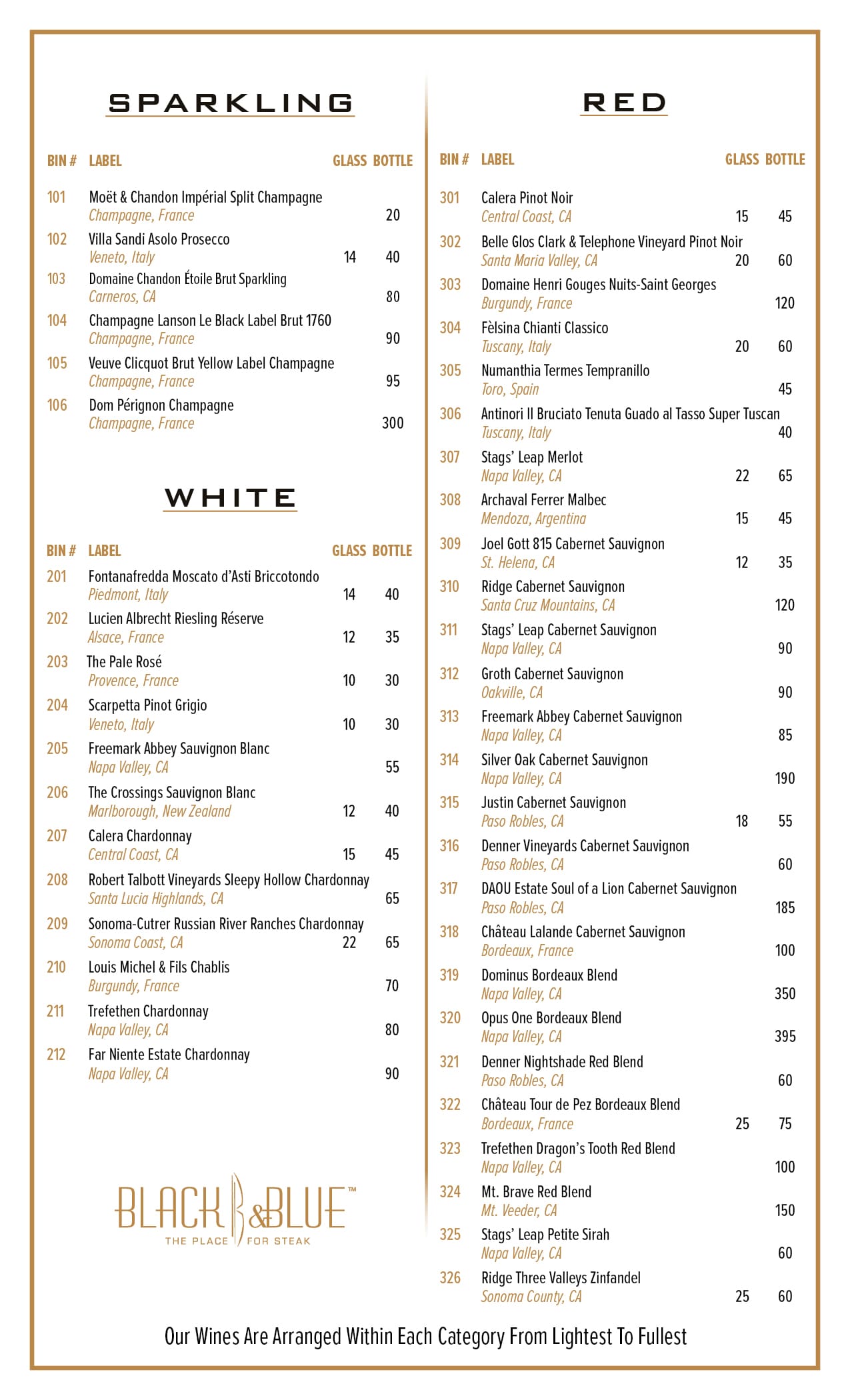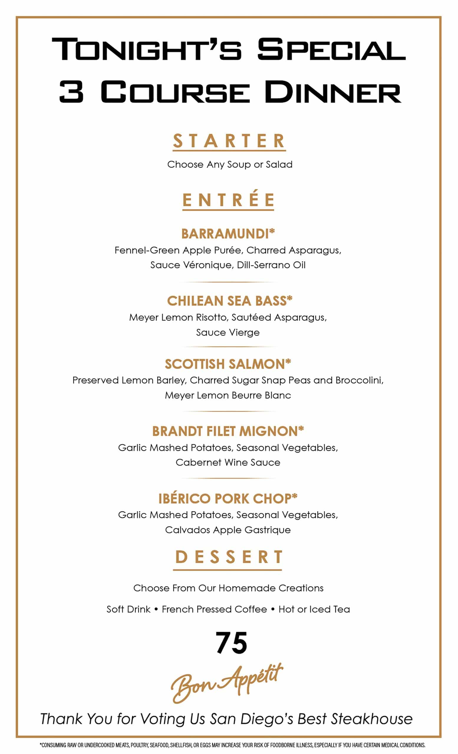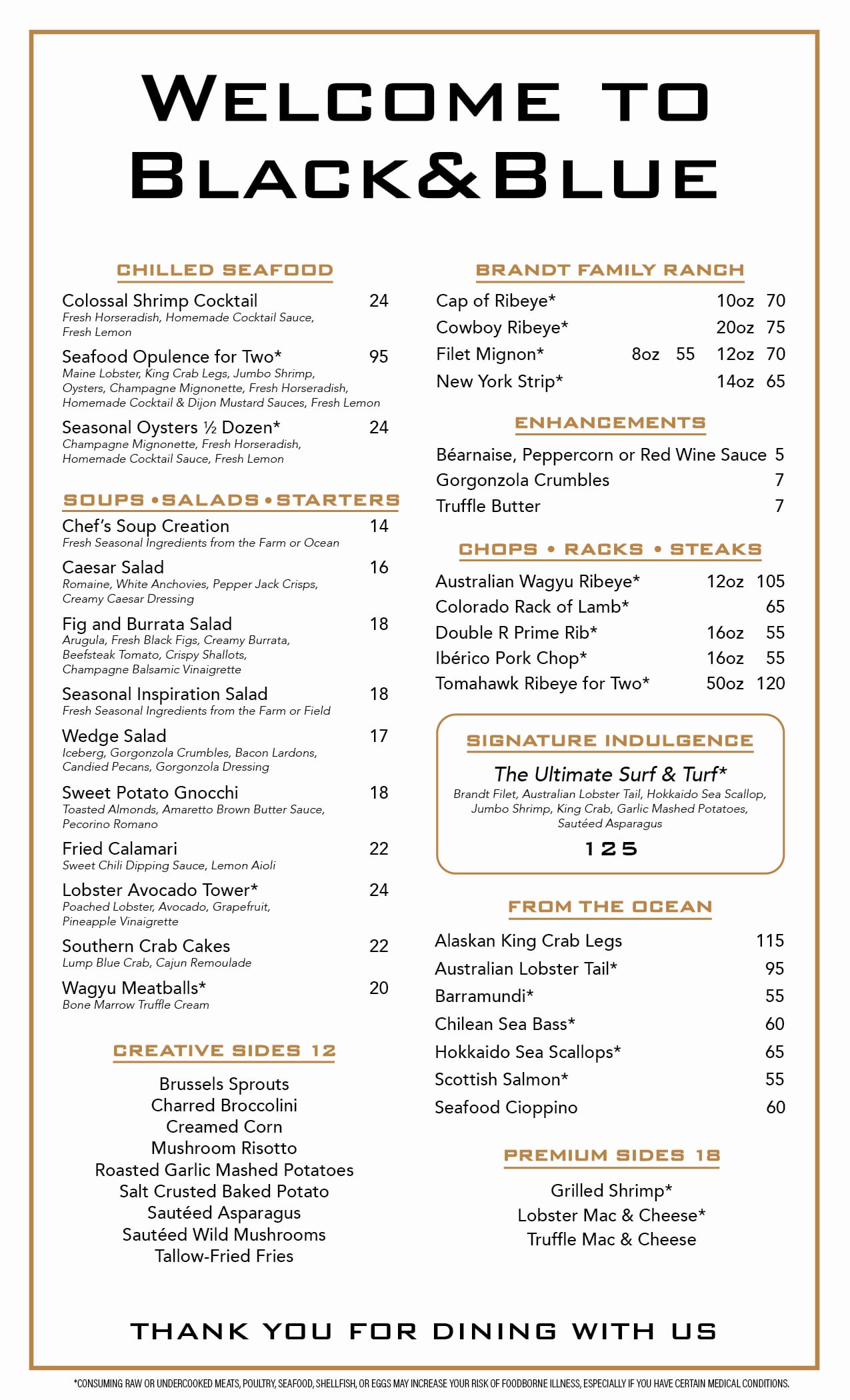 Black & Blue also offers guests an exquisite three-course meal from our signature special menu for just $75. Choose from fresh gourmet options including Caesar salad, filet mignon, crème brûlée and more.