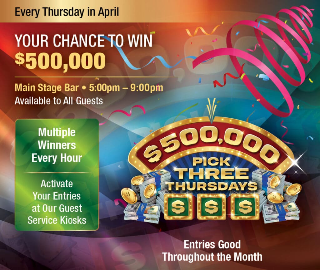 Main Stage Bar$500,000 Pick Three Thursdays Join us for our $500,000 Pick Three Thursdays promotion where you could win a huge grand prize. Every hour from 5:00pm – 8:00pm, five guests will […]