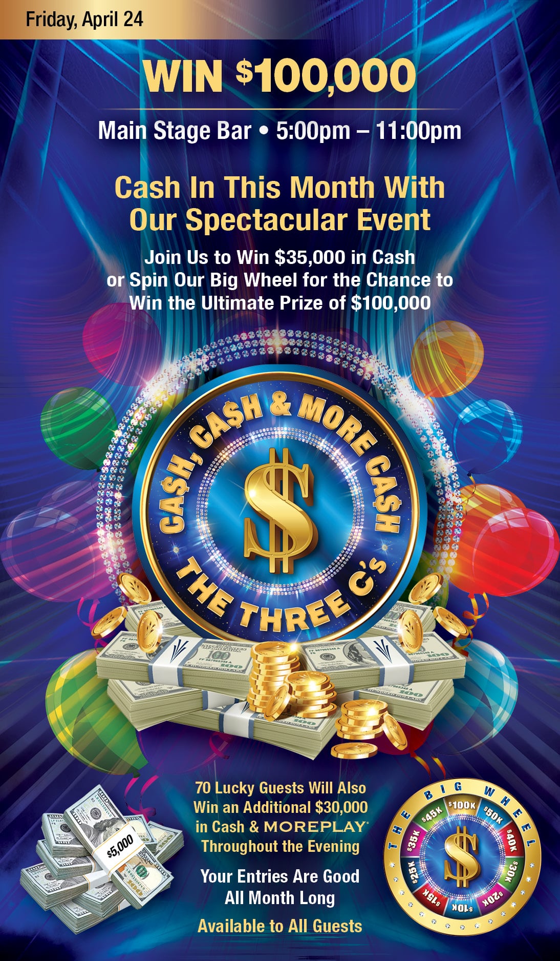 Join us for our NEW spectacular giveaway, The Three C’s: Cash, Cash & More Cash! On Friday, April 24, you could win $35,000 cash or a spin on our Big Wheel for the chance to win the ultimate prize of $100,000!