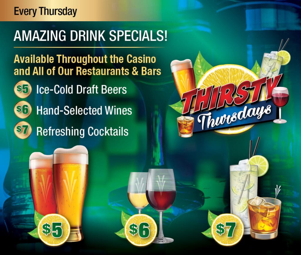 Enjoy these specials at any of our award-winning restaurants, convenient bars or while you play your favorite slots and table games. You won’t want to miss out on these thirst-quenching deals!