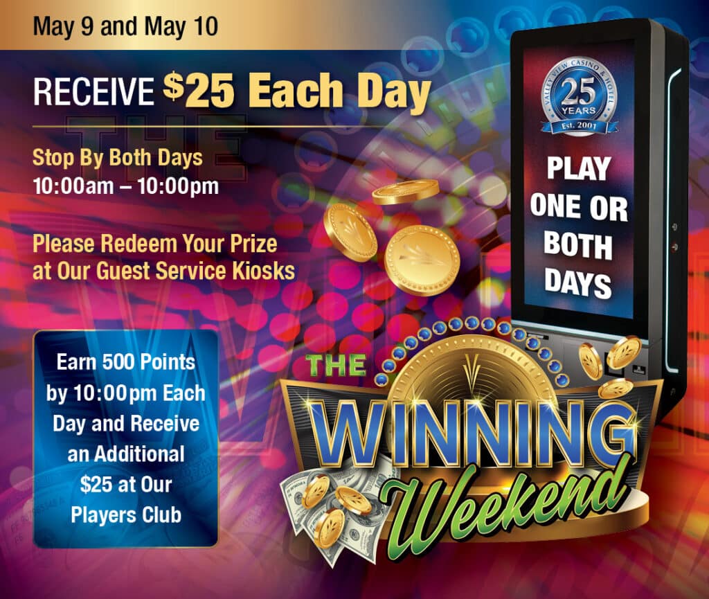 Invited guests will swipe their Players Club card at any of our guest service kiosks to receive $25 instantly during our Winning Weekend event happening on Saturday, May 9 and Sunday, May 10. Every invited guest can swipe one or both days. Visit our Players Club to learn how you can receive an invitation.