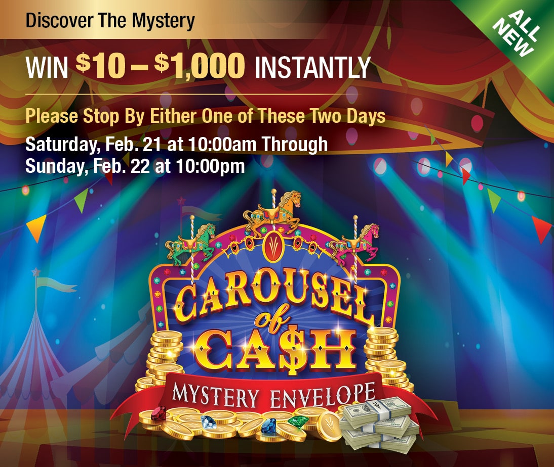 Carousel of Cash Mystery Envelope Are you ready to discover your prize? Invited guests will bring in their unopened Mystery Envelope on March 21 or March 22 to reveal a prize of $10 – $1,000. To learn more about or Mystery Envelope promotion and to find out how you can participate, please visit our Players […]